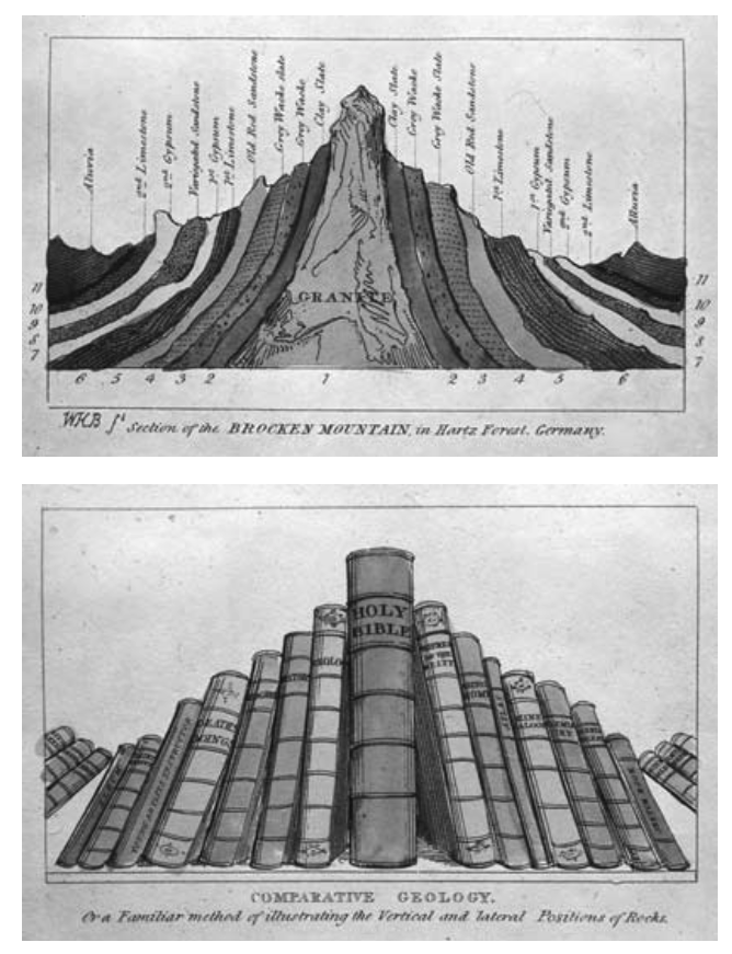 - [165-2] またライエルは、中央フランスには最近の大洪水の形跡はないとスクロープに説得され、バックランドの洪水説へ疑念を抱くようになった。とくに、この洪水が聖書の洪水と同定されている点には懐疑的だった。この疑念は、オックスフォードが体現する、国教会の政治・文化的権力への反感によって強められた。そしてライエルは、洪水のみならずあらゆる「激変」を排除しようと企て、[165-3] ヨーロッパで大規模な地質調査を行った。