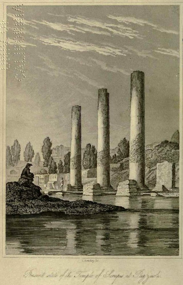 - [167] 図7.5: 『地質学原理』第一巻(1830)の扉絵。 ナポリ近郊の遺跡セラピス神殿の柱には、海の軟体動物によって侵食された跡がある。つまり、古代ローマから現代までのあいだに、柱が立っていられるほどゆっくりとしたペースで、土地が一旦沈下して元に戻った。これは、地球が定常的な動的平衡状態にあるというライエルの解釈のミニチュア版である。